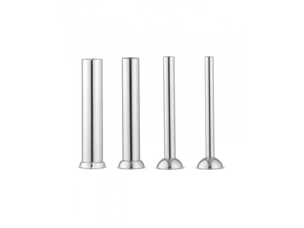 Plnička na klobásy z nerezové oceli. Jednoduchá na obsluhu. Regulovatelná rychlost do 7m/s. Součásti jsou 4 nerezové plnící nástavce o průměru: 16, 22, 32, 38 mm.