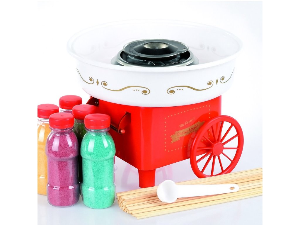 V této sadě najdete vše, co pro domácí výrobu cukrové vaty potřebujete. Stroj pro její výrobu, pět druhů ochucených cukrů, špejle a odměrku.